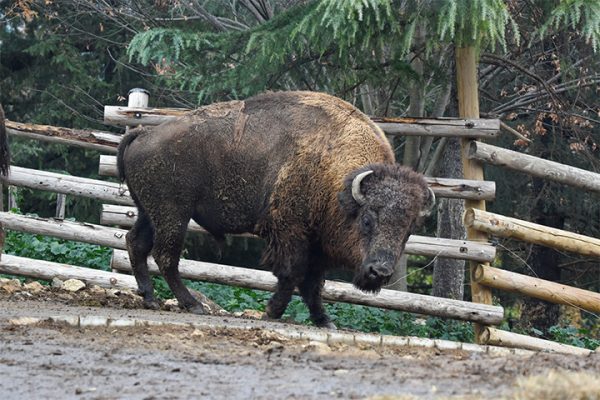 頭が非常に大きく、肩が盛り上がっているため、頭を低く下げたような姿勢になります。オス・メスともに短い角を持っており、毛の色は黒みがかった褐色です。肩から前脚、頭部、のどにかけては、長くて厚い毛が発達しています。