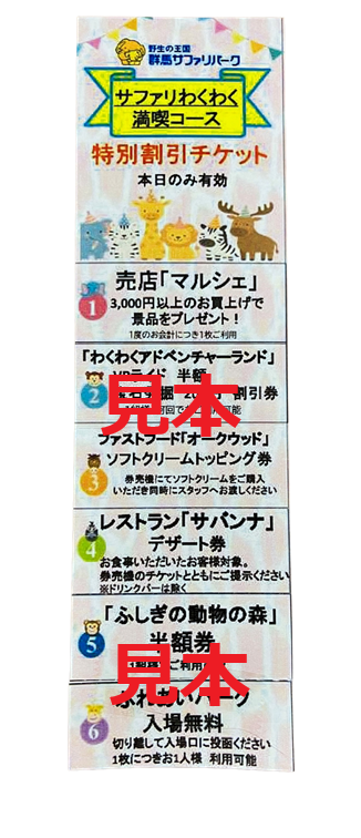 春の群馬サファリを楽しむプラン解説 春休みや新生活前の思い出づくりに、特別な体験を探していませんか。群馬県富岡市にある群馬サファリパークでは、春限定のお得なプランが続々登場しています。ライオンやサイなどを間近で体感できるサファリ体験に加え、エサやりやふれあい体験までセットになった充実内容です。ファミリー、グループ、学生、新社会人のみなさんにぴったりの“満足度重視”プランを選べば、見た目の価格以上の感動が待っています。どうせ行くなら、内容充実の特別プランで春の思い出を最高の形に仕上げてみませんか。 バーベキューテラス付近 【1】冬の感謝割はコスパが最強(3月20日まで) 今いちばん注目したいのが、3月20日までの期間限定「冬の感謝割」です。入園料に加えて、エサ体験やふれあいパークの入場券がセットになった特別企画で、通常よりも700円お得に楽しめます。通常は別料金となる体験が含まれているため、結果的にトータルコストを抑えながら内容はグレードアップします。動物に直接エサをあげる瞬間は、お子さまはもちろん大人も思わず笑顔になってしまいます。「せっかく行くならエサやりやふれあい体験もしたい」と考えているなら、迷わずこのプランがおすすめです。価格以上の満足感を実感できますよ。ただし、前売り限定なので当日朝7時までに購入する必要があります。 当日の朝7時まで購入できます 【2】卒業割は思い出づくりに最適なプラン(4月5日まで) 様々な卒業シーズン向けの「卒業割+選べる2つのフォトプラン」は、懐かしい使い捨てカメラ(レンズ付きフィルム)やオリジナルフォトフレーム付きの記念プランです。スマートフォンとは違うレトロな味わいの写真は、あとから見返したときに特別な思い出になります。ちなみに、卒業する内容は問いません。「幼稚園を卒園」「学校を卒業」「会社員を卒業」「グループを卒業」「タバコやお酒を卒業」など、○○を卒業と言えればOK。窓口で聞くかもしれませんので、答えを準備しておいてください(笑)。もちろん、友人同士のグループ旅行や、卒業旅行を兼ねたお出かけにぴったりです。サファリゾーンでのドキドキ体験や、ふれあいエリアでの癒しの時間をぜひフィルムに残してみませんか。 通常より最大1,200円もお得にご利用いただける特別価格で、サファリゾーンでの迫力ある動物たちとの出会いや、園内で過ごす大切な一日を、そのまま写真に残せます。撮影可能枚数は12枚。選び抜いたシーンだけを写す、特別なフォト体験をどうぞ。 卒業割+選べる2つのフォトプランの購入 【3】春の満喫プラン(仮称)は大満足な内容(4月5日まで) 春の目玉企画として登場予定なのが「春の満喫プラン(仮称)」です。通常の入園料に加え、サファリバスや各種体験チケット、お店や施設の割引特典チケットが多数付いてくる予定です。まさに春の群馬サファリを遊び尽くすための特別パッケージです。「これ買っておけば間違いなし!」で、個別に購入するよりも効率よく、しかもお得に楽しめる内容になる見込みです。ファミリーや新社会人のリフレッシュ旅にも最適な内容となっています。 ※こちらも詳細は後日発表となります。 レギュラープランより“充実プラン”が断然おすすめ 通常入園料は大人3,200円、子ども1,600円、シニア2,800円です。園内周遊バスやガイドツアーは別料金ですが、せっかくなら体験料込みのプランを選ぶことでコストパフォーマンスと満足度が大きく変わります。見た目の安さだけで選ぶより、各種体験がセットになったプランの方が結果的にお得で充実した一日になります。 春の群馬サファリパークで特別な一日を 春は動物たちも活発に動き始める季節です。ライオンやホワイトタイガーの迫力ある姿や草食動物たちの穏やかな表情を間近で楽しめます。ふれあいパークではショーやイベントも毎時1回以上開催され、幅広い世代の方々が一日中満喫できるようになります。チケットはインターネット事前購入がおすすめです。WEB限定割引価格もあるため、賢く活用するとよりお得です。春の思い出づくりは、体験重視の特別プランから選んでみませんか。群馬サファリパークで、心に残る一日を過ごしてください。 便利でお得なWEBチケット ホワイトタイガー
