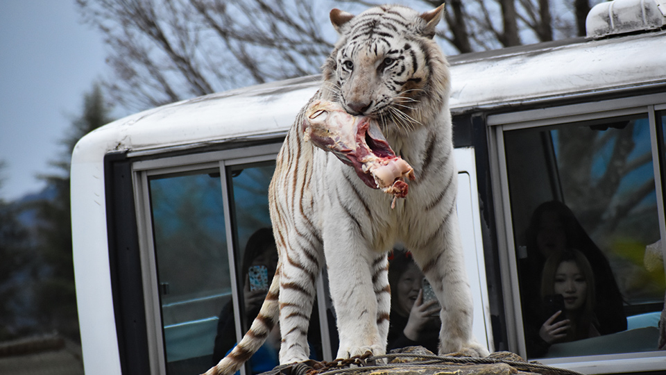 2026年の春再開!夕暮れサファリバスツアーが新価格(実質値下げ)でリニューアル 群馬県富岡市にある群馬サファリパークの人気ツアー「夕暮れサファリバスツアー」が、2026年の春休みからいよいよ再開します。そして今年は、より参加しやすくなった新しい料金体系でスタートします。長い冬の間、楽しみにしていたお客様にとって嬉しいお知らせをたっぷりお届けしますので、ぜひ最後までご覧ください。 ここ、群馬でしか体験できない!夕暮れサファリバスツアーの魅力 夕暮れサファリバスツアーは、群馬サファリパークのオリジナルツアーで、全国の動物園・サファリパークを見渡しても、夕方の時間帯に動物たちのディナータイムを間近で体験できるのはここだけです。このツアーの最大の見どころは、やはり「動物たちの食事風景」です。エサが準備されると、草食動物たちが一斉に群がり、列をなして食事に向かう姿は圧巻。さらにバスのすぐ横では、大きな肉の塊をめぐってライオンの群れが激しくせめぎ合います。ホワイトタイガーは岩の上に軽々と飛び乗り大きな骨付き肉をむさぼります。昼間の穏やかな様子とはまったく異なる、野生本来の迫力をバスの中から安全に体感できます。2026年度はウォーキングサファリゾーンでの滞在時間も増える予定ため、動物たちをじっくり観察する時間がさらに充実します。 肉にかぶりつくライオン ▼夕暮れサファリバスツアーの詳細ページ 2026年度の大きな変更点|トータル料金を抑えて参加しやすくなりました 2026年の夕暮れサファリバスツアーは料金体系が大きく変わります。これまでは「入園料(大人3,200円)+バス代(1,000円)=4,200円」というご案内でしたが、2026年の新価格では、ツアー代金として大人3,200円・子ども2,100円と大幅にお求めやすい設定として実質値下げになります。夕方からツアーだけに参加したい(夜活需要)お客様にお応えして、よりシンプルでわかりやすい価格になりました。昨年度の利用実績から7割以上のお客様が夜のみのご利用だったことも変更した理由です。また、日中に入園されたお客様には嬉しい割引制度もあります。当日の入園券をご提示いただくと、大人は1,000円引きの2,200円、子どもは500円引きの1,600円でご参加いただけます。日中のサファリを楽しんだあと、そのまま夕暮れツアーへ続けて参加する場合もお得にご利用いただけます。なお、日中の入園権利は17時の閉園時間をもって終了となります。夕暮れサファリバスツアーは夜の別プログラムとしてお申し込みください。 骨付き肉を持ち帰るホワイトタイガー 当日の流れと参加方法 ツアーの出発時間は17:00です。発車の20分前までに総合案内所「バス受付窓口」で乗車手続きをお済ませください。1日あたり定員100名の人気ツアーのため、WEBサイトからの事前予約をおすすめします。当日券は第一駐車場内のバス受付窓口でも販売しますが、満席になると購入できない場合があるので注意が必要です。チケットはインターネットから事前に購入すると、WEB限定の割引価格でご利用いただけます。春休みや大型連休など混雑が予想される時期は、特に早めのご予約をお願いします。 ▼夕暮れサファリバスツアーのチケット予約・購入はこちらから まとめ|今年の夕暮れサファリはさらにお得に、さらに充実! 2026年の夕暮れサファリバスツアーは、群馬サファリパーク限定の感動体験はそのままに、料金が下がりシンプルな構成になり参加しやすくなりました。ライオンやホワイトタイガーが肉に飛びつく瞬間、草食動物たちが列をなす食事風景、ウォーキングサファリゾーンでのゆったりとした観察時間。これらすべてを安全に体験できるのは、ここ群馬サファリパークだけです。春休みのお出かけ計画にぜひ加えてみてください。チケットの購入や最新の開催スケジュールは、公式チケットサイトでご確認ください。 ▼夕暮れサファリバスツアーの詳細ページ アメリカバイソン