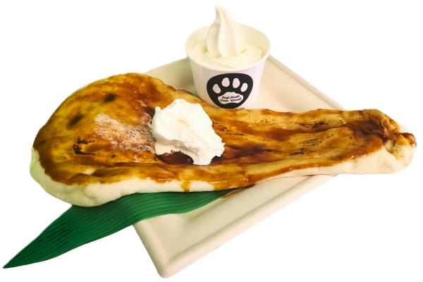 群馬名物の「焼きまんじゅう」のただのパロディ版ではありません。甘いアイスにしょっぱいタレ、あったかいナンに冷たいアイス、この組み合わせ言葉にできない最高のハーモニー。絶対うめぇから、食ってみてくんな!
