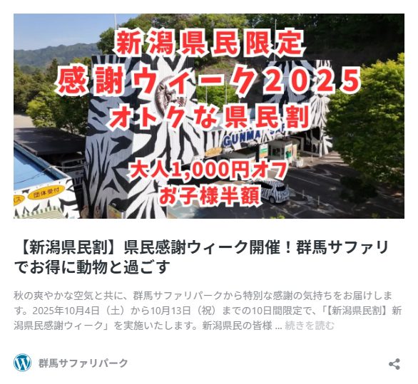 群馬県富岡市の群馬サファリパークでは、日頃より多くご来園いただいている新潟県の皆様へ感謝の意を表し、【新潟県民割】新潟県民感謝ウィークを開催いたします。 実施期間 2025年10月4日(土)~10月13日(祝) 割引内容 大人:通常 3,200円 → 2,200円(1,000円引き)お子様(3歳~中学生):通常 1,700円 → 850円(半額)シニア(65歳以上):通常 2,400円 → 大人料金 2,200円を適用※本割引は「入園券」のみ対象となります。園内周遊バス、ガイドツアー等は別料金です。 ご利用方法 新潟県にお住まいであることを確認できる身分証を、受付にてご提示ください。チケットはWEB事前購入、または当日窓口にてご購入いただけますが、混雑緩和のためWEB購入を推奨しております。 この機会にぜひ、秋の自然とともに動物たちとのひとときをお楽しみください。皆様のご来園を心よりお待ち申し上げます。 WEBチケット購入はこちらから 新潟県民割のブログ記事はこちらhttps://safari.co.jp/blog/4240/