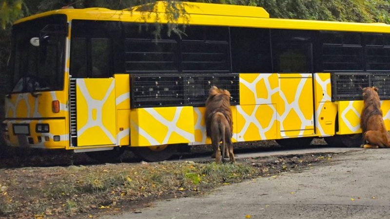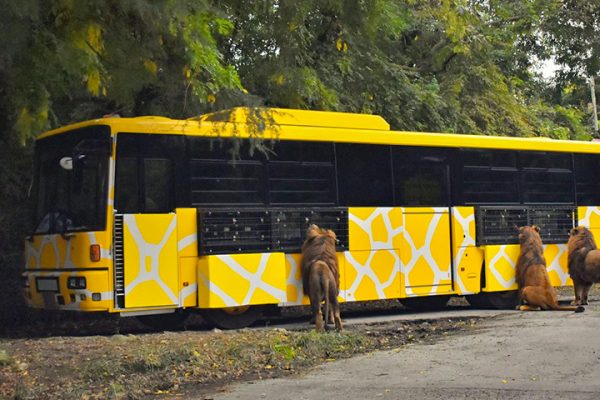 黄色いキリン柄のバスに乗って、みんなで楽しくサファリを楽しみましょう。