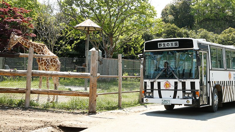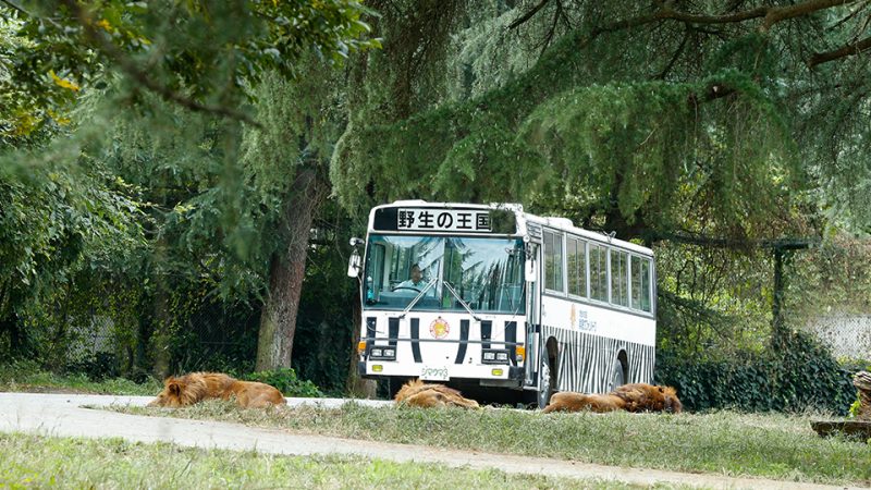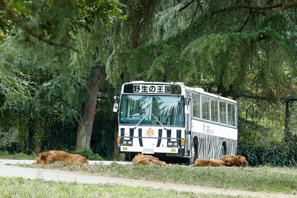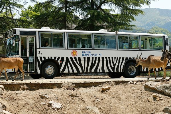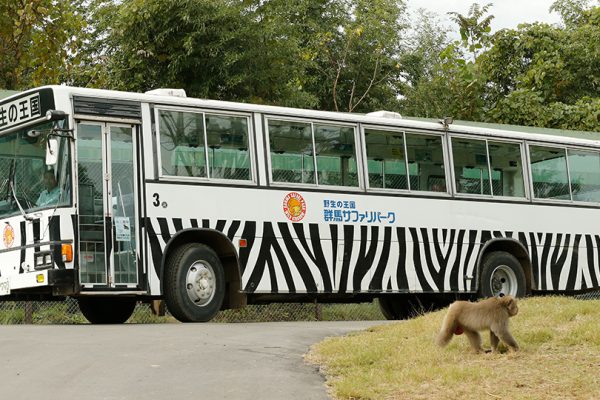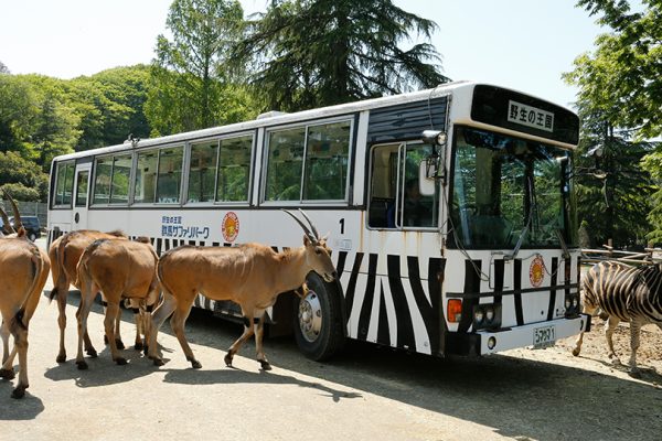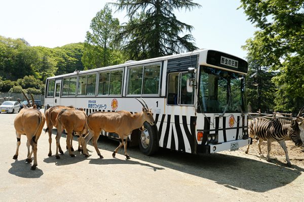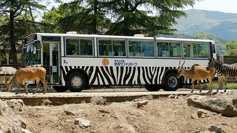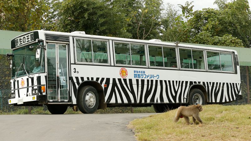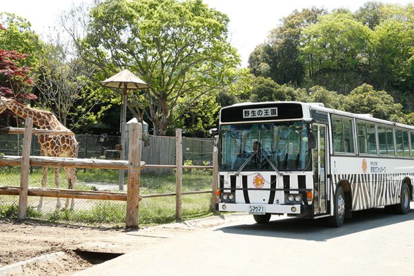 自然の大地の冒険気分を盛り上げるゼブラパターンのサファリバスで各ゾーンを巡ります。