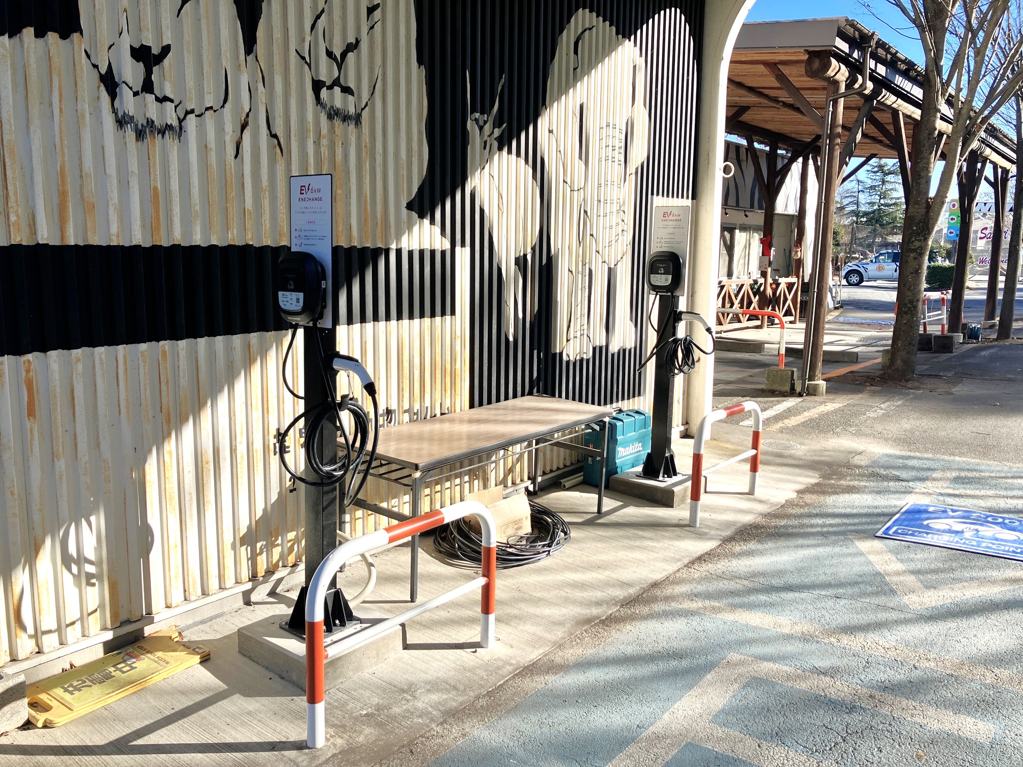 入場ゲート下(チケット売場側)に電気自動車向けのEV充電設備(チャージャー)を2基準備しております。